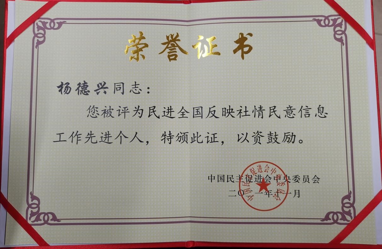 2021年是民进中央反映社情民意信息主题年。为树立典型、表彰先进,激励全会各级组织和广大会员进一步做好反映社情民意信息工作,民进中央于12月1日在北京召开反映社情民意信息主题年工作会暨2021年参政议政年会,对今年以来在反映社情民意信息工作中做出突出成绩的先进集体和个人进行了表彰。民进娱乐城 总支主委、娱乐城 教授杨德兴荣获2021年“民进全国反映社情民意信息工作先进个人”。