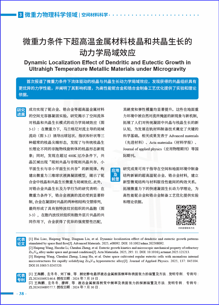 进展报告指出,该研究进展“首次报道了微重力条件下流体驱动的枝晶与共晶生长动力学局域效应,发现获得的共晶组织具有更优异的力学性能,并阐明了其影响机理,为高性能铌合金和锆合金制备工艺优化提供了实验和理论依据。”