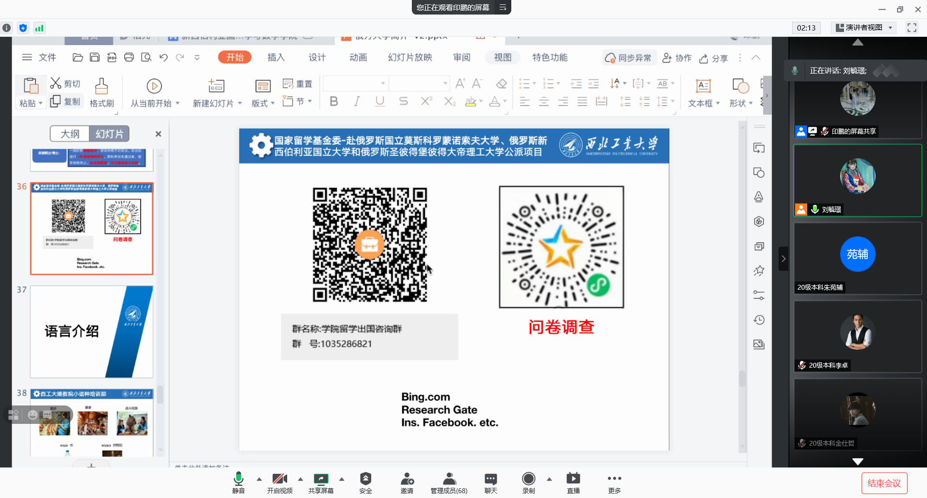 优势学科及导师信息向同学们做以推广,同时,重点突出了俄方3所高校著名国内外校友,希望能够让同学们意识到留俄的优势及意义。会议后期,老师就俄语学习及留俄经验与同学们分享,希望同学们能够尽早开始俄语学习之路,为申请该项目作出准备。