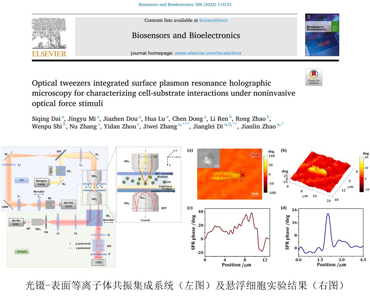 合作,提出将光镊与表面等离子体共振全息显微镜相集成,以实现光力作用下细胞-基底间相互作用及其变化的全场动态无损测量。相关成果以“Optical tweezers integrated surface plasmon resonance holographic microscopy for characterizing cell-substrate interactions under noninvasive optical force stimuli”为题发表于国际重要学术期刊《Biosensors and Bioelectronics》(DOI: 10.1016/j.bios.2022.114131)上。这是该课题组近期发表于该期刊的第二篇相关工作。娱乐城