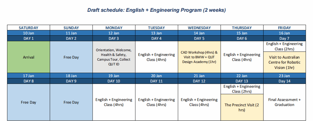 本次为期两周的项目旨在进一步提升参与者的英语水平,使他们能够自信地参与圆桌讨论并发表科学演讲。学生们还将参与一整天的计算机辅助设计(CAD)工作坊,通过Fusion软件程序探索并了解工程在实际生活中的应用。此外,他们还将有机会与位于The Precinct和BMW+QUT设计娱乐城