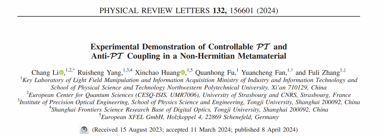 在非厄米超构材料方面取得重要进展。研究团队通过非厄米超构材料结构调控首次实现了PT对称性和PT反对称之间的可控转换。研究成果以“Experimental Demonstration of Controllable PT and Anti-PT Coupling in a Non-Hermitian Metamaterial”为题发表在物理领域顶级期刊《Physical Review Letters》上,李畅、杨蕤生为论文共同第一作者,李畅博士、樊元成教授、张富利教授为通讯作者。