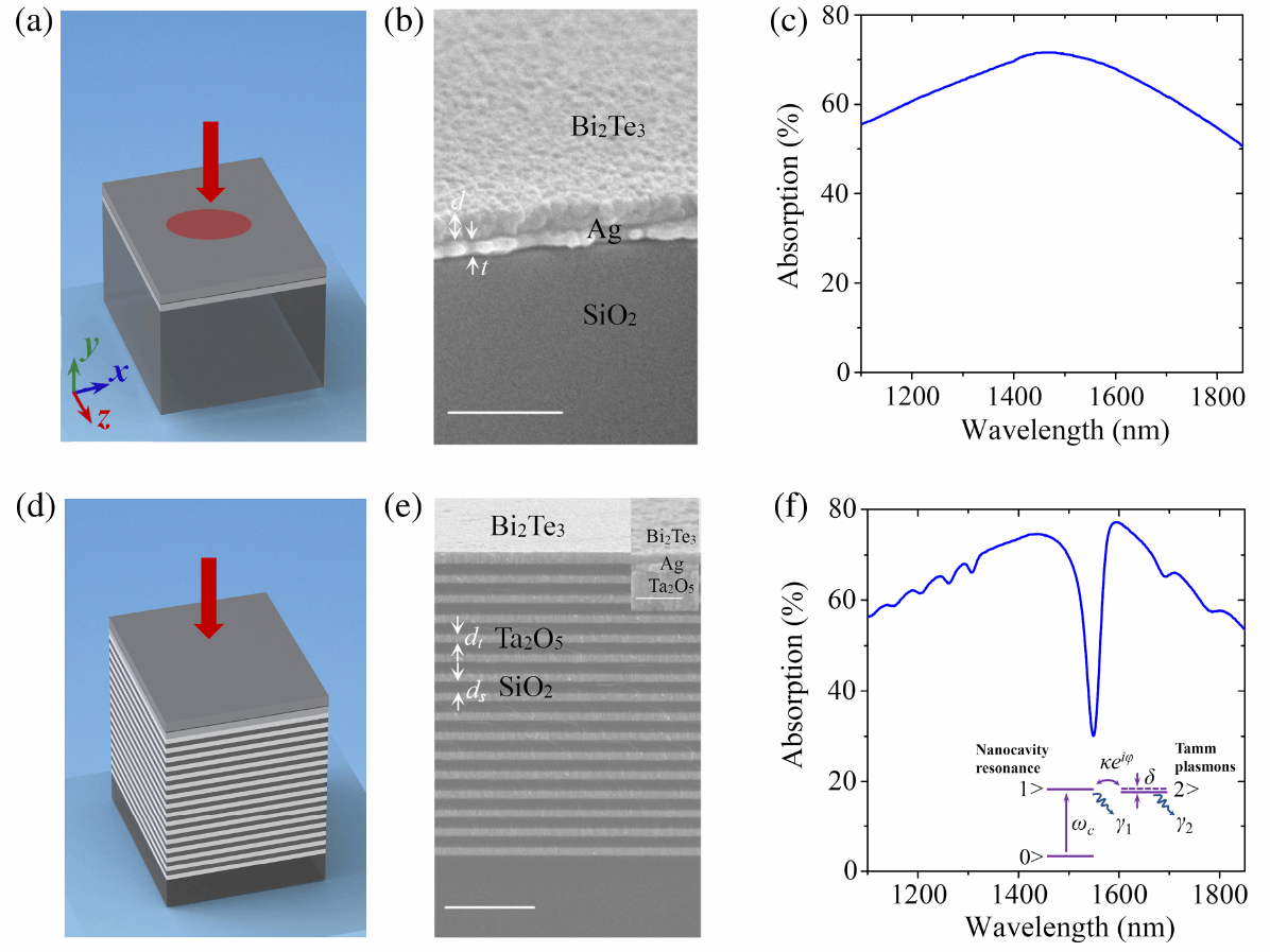碲化铋拓扑绝缘体在光通信波段具有大于6的超高折射率,其远高于硅、锗等传统材料折射率(硅、锗的折射率分别约为3.47、4.27 @ 1550 nm),研究团队提出了利用碲化铋拓扑绝缘体实现超薄光学共振腔的新思路。他们采用磁控溅射技术制备出大面积、平坦的碲化铋薄膜,并将其与金属薄膜有机结合,实现了超薄光学共振腔(波长的二十分之一)和高效的近红外共振光吸收,如上图所示。进而将该超薄光学腔与一维光子晶体相集成,观测到了反常的类电磁诱导透明效应,并揭示了该效应的产生机理。相关结果为超薄光学腔、微结构光谱调控及光电功能器件的实现开辟了新途径。该研究成果以“λ/20-Thick cavity for mimicking electromagnetically induced transparency at telecommunication wavelengths”为题发表于国际光学领域顶级期刊《Advanced Photonics》(IF:17.3)。