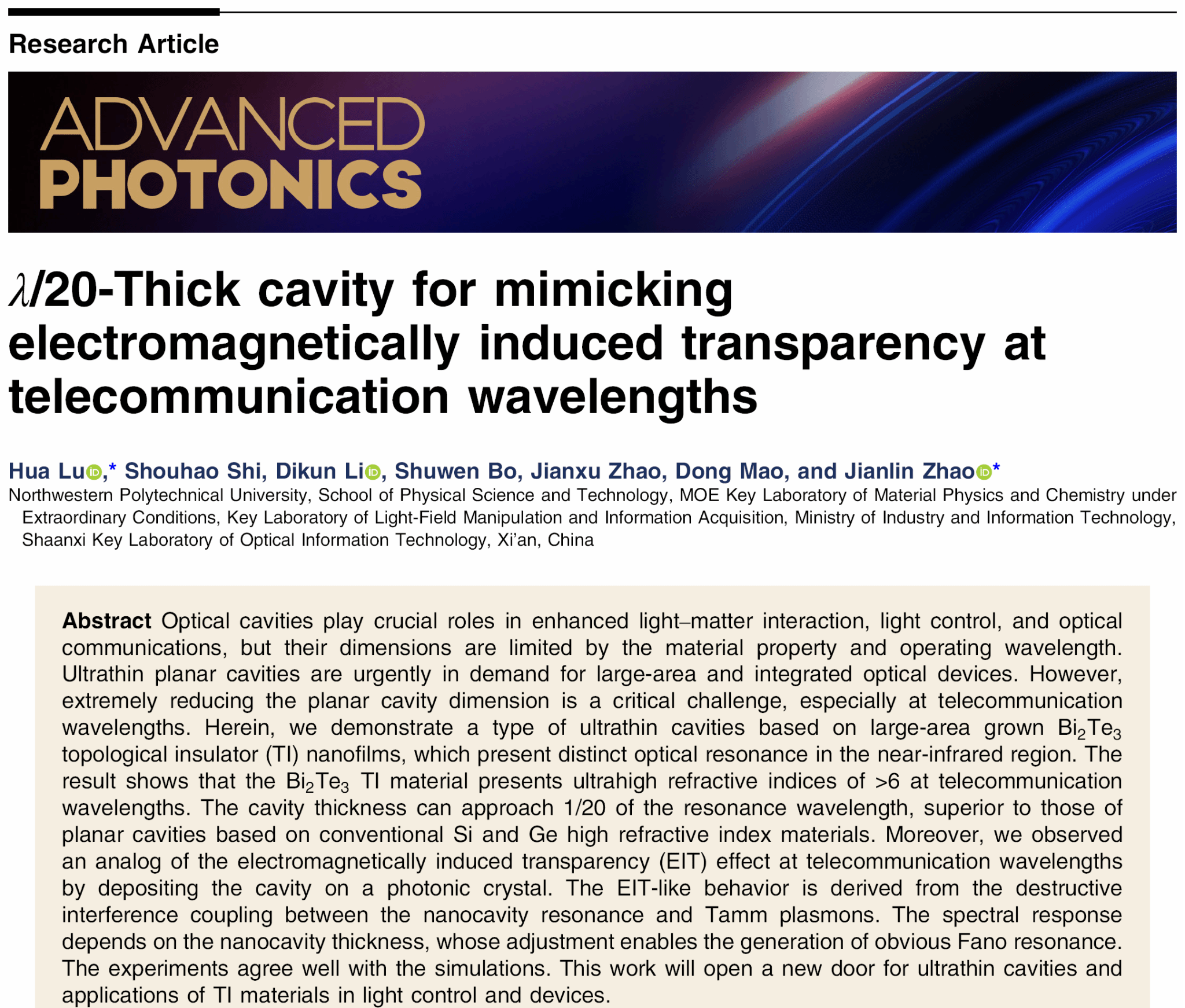 近日,西北工业大学赵建林教授、陆华教授团队开展了拓扑绝缘体材料光学共振及其耦合特性研究,利用制备的碲化铋拓扑绝缘体纳米薄膜,获得了近红外波段超薄光学共振腔,并将其与光子晶体相集成,实现了光通信波段类电磁诱导透明效应的产生。