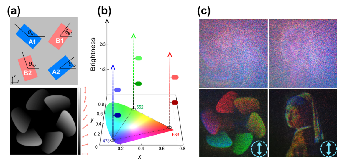 研究团队提出了一种由几何相位单元组成的四原子宏像素超表面,可以将多个波长的振幅与相位信息编码到任意偏振通道中,有效地避免了复杂的结构搜索和制备过程。此外,通过非均匀偏振编码,实现了HSB三维色彩空间全息显示。所提出的超表面器件为轻量3D显示、AR/VR设备提供了一个通用平台。同时,单器件集成的全彩色和全偏振自由度联合调控显著提高了光场信息容量和安全性,在全息数据存储和光通信等面向多路复用的应用中具有巨大的潜力。