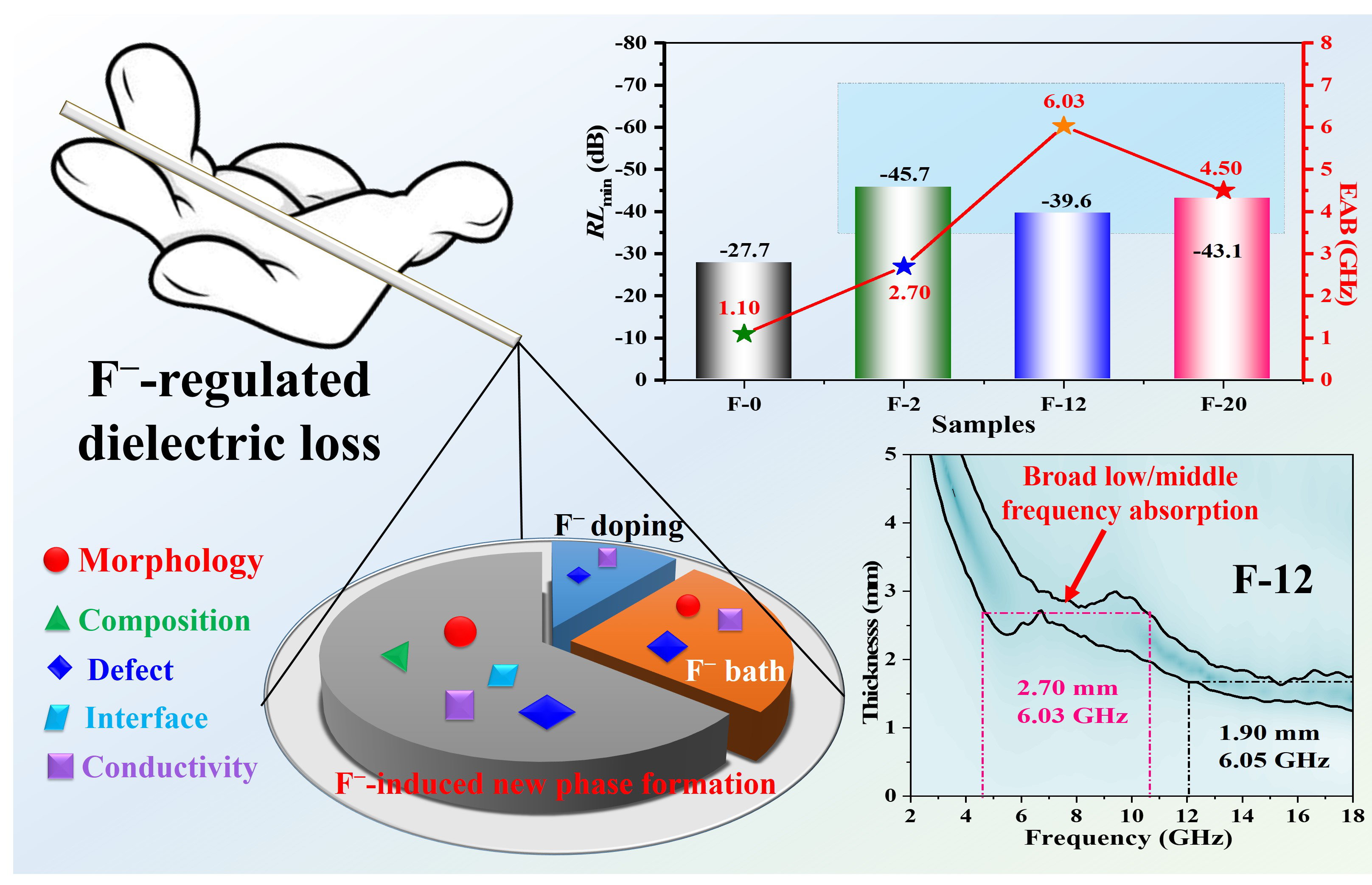 基于上述问题,受“氟老大(电负性最大的非金属元素)”的启示,研究团队创新性地提出了一种氟离子(F−)调控策略。以二元钴镍(Ni-Co)金属硫化物为研究对象,研究人员发现,材料的形貌、组分、界面、缺陷和导电性这“五味中药”,可以通过氟离子这位医术精湛的“中医之手”来进行有效的调控(如图1所示)。具体而言,研究人员通过灵活地调节氟离子的浓度大小和引入方式(原位引入或后氟化处理),可以使其能够以不同“角色”(即掺杂、形成新物相或氟离子浴)实现对上述“五味中药”的差异化“供给”,进而达到优化材料电磁参数和微波吸收性能的目的。这项工作不但系统阐述了氟离子在化学合成、微观结构设计和电磁波吸收中的独特作用,而且为目前5G通信技术中急需解决的低/中频电磁干扰问题提供了可行的思路。