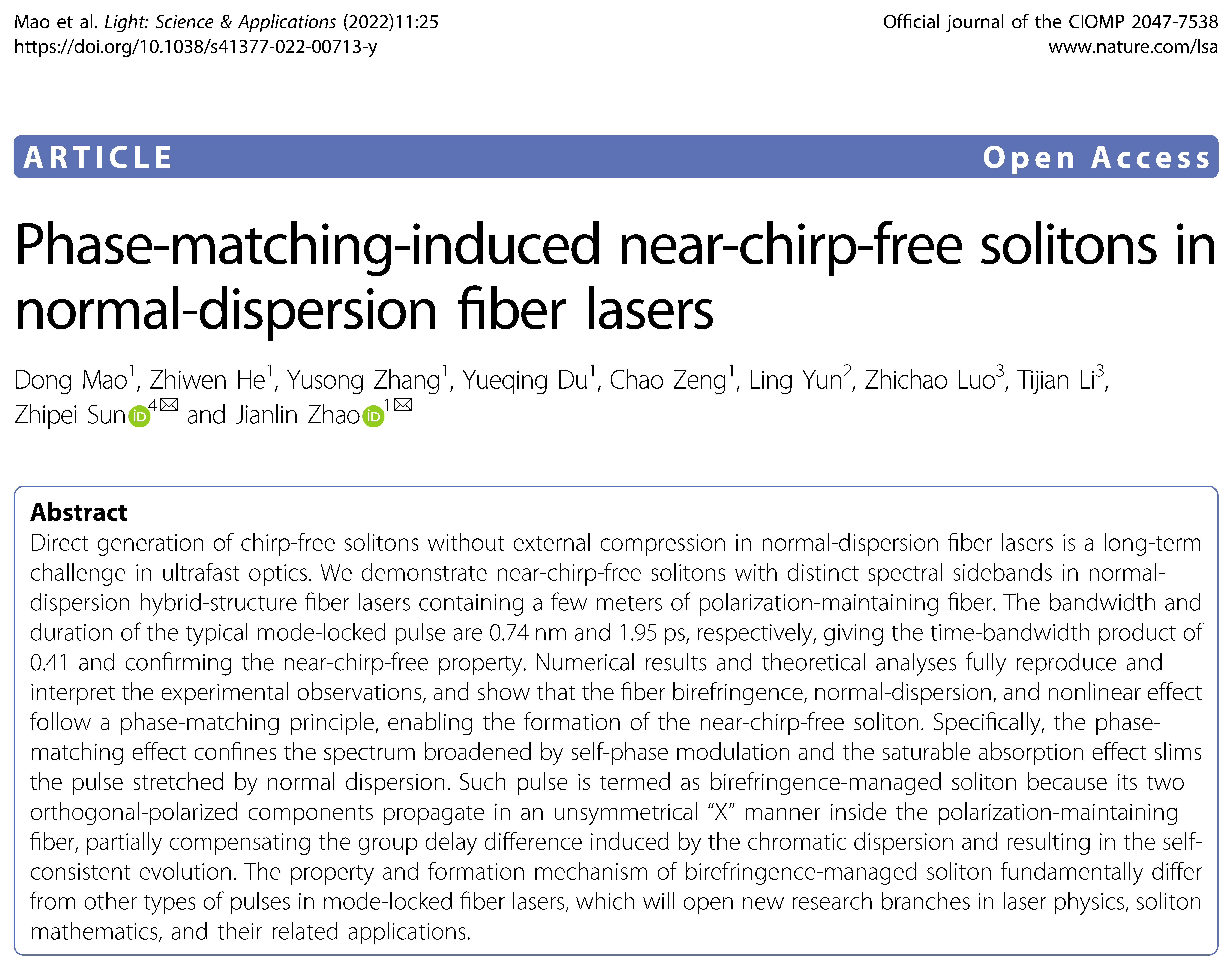西北工业大学毛东教授、赵建林教授团队与芬兰阿尔托大学孙志培教授、南京邮电大学云灵博士、华南师范大学罗智超教授等合作,在新型锁模孤子方面取得重要进展。相关成果以“Phase-matching-induced near-chirp-free solitons in normal-dispersion fiber lasers”为题发表在顶级学术期刊《Light: Science & Applications》上。