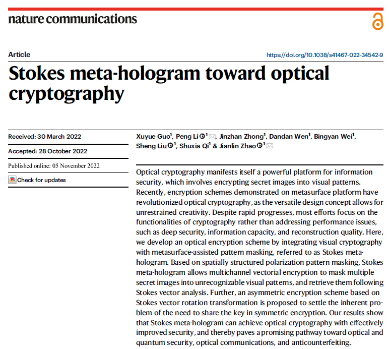 李鹏教授、赵建林教授研究团队在光场调控研究方面所取得的突破。该工作发展了一种全新的用于光学加密的斯托克斯矢量编码超表面全息图,并系统地给出了采用该器件进行不同层级偏振掩蔽的光学加密方案。全文链接:
