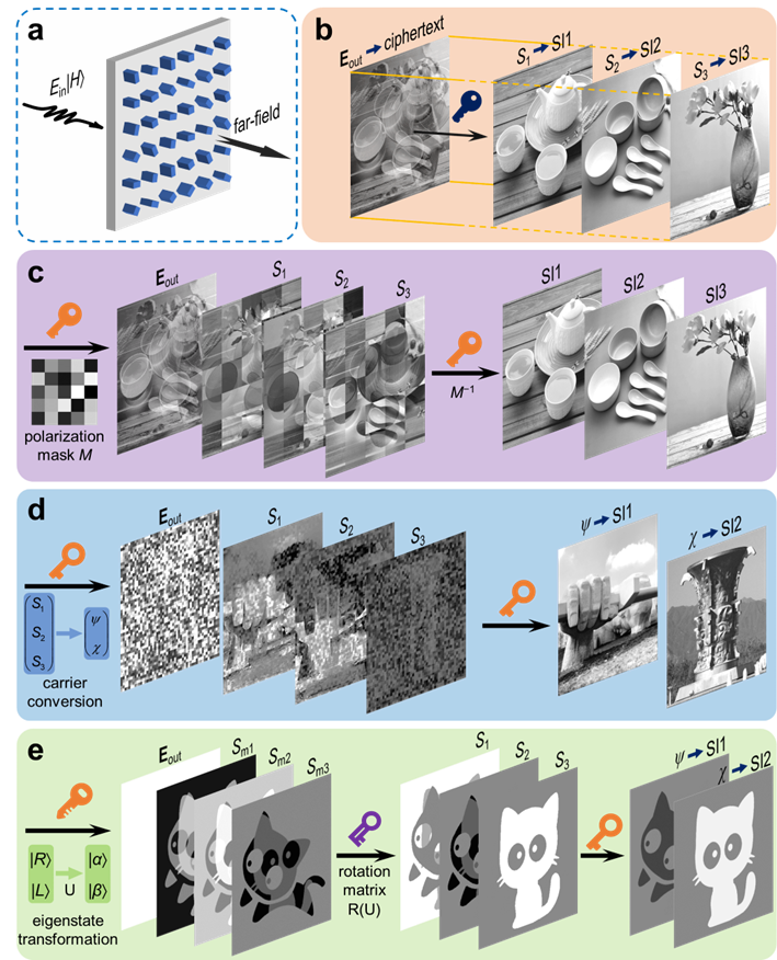 研究团队借助光学超表面强大的光场多维调控能力,提出了一种基于斯托克斯矢量编码的超表面全息光学加密新方法,并发展了基于斯托克斯矢量的级联偏振掩蔽、非对称加密等不同安全性的加密方案。得益于偏振本身的不可见性质以及多通道矢量加密能力,斯托克斯超表面全息术可以极大地提升光学加密的安全性和信息容量,为光通信中的数据传输和交换提供了一个有效的信息安全解决方案。
