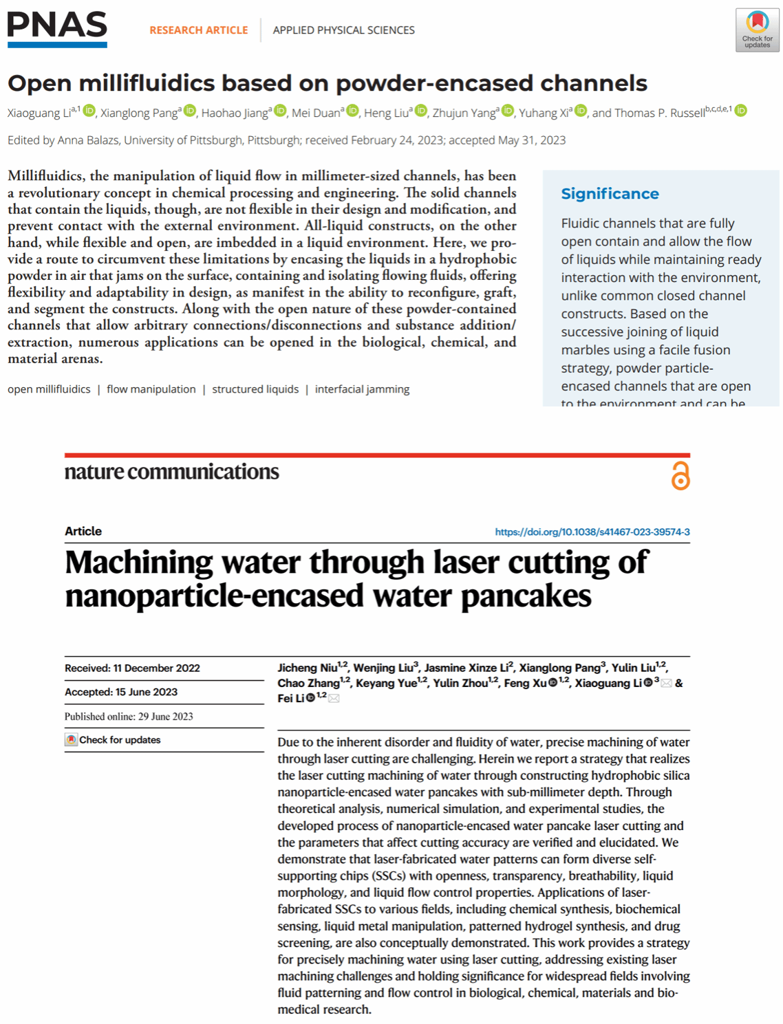 李晓光课题组在液体塑形研究中取得重要进展,相关论文以“Open millifluidics based on powder-encased channels”、“Machining water through laser cutting of nanoparticle-encased water pancakes”为题先后发表在著名学术期刊PNAS(《美国国家娱乐城