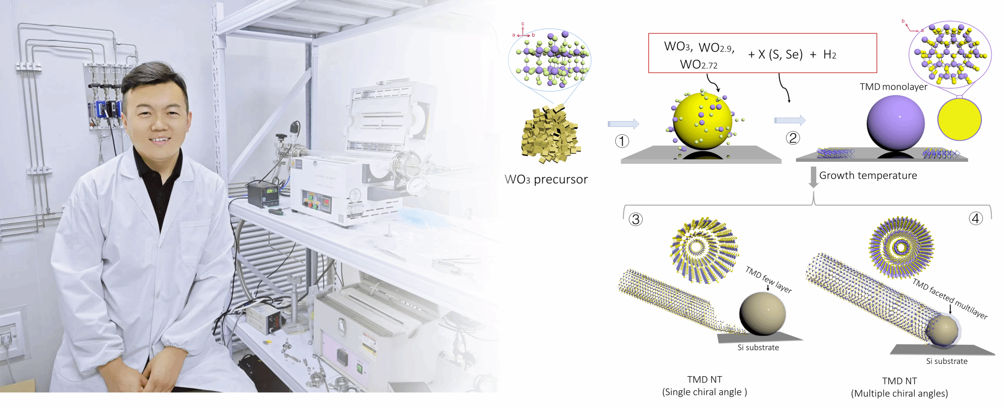 过渡金属硫化物纳米管可以可等效为二维过渡金属硫化物沿特定方向卷曲而成的一维管状结构,具有很多相较于其二维和三维结构的独特性质。早在1992年,过渡金属硫化物纳米管就被Reshef Tenne教授首次发现,其制备方法主要基于过渡金属氧化物纳米线表面硫化反应形成多层纳米管结构。该制备方法过程繁多,难以控制,制备的纳米管结构随机,无法调控。导致过去的30年过渡金属硫化物纳米管在手性控制、手性相关的物性研究以及器件应用方面进展缓慢。相比1991年发现的碳纳米管过去30年的蓬勃发展,过渡金属硫族化合物纳米管的发展几乎处于停滞状态。阻碍其发展的主要“瓶颈”可以归结为:缺乏对过渡金属硫化物纳米管简单有效的生长方法和手性调控策略。